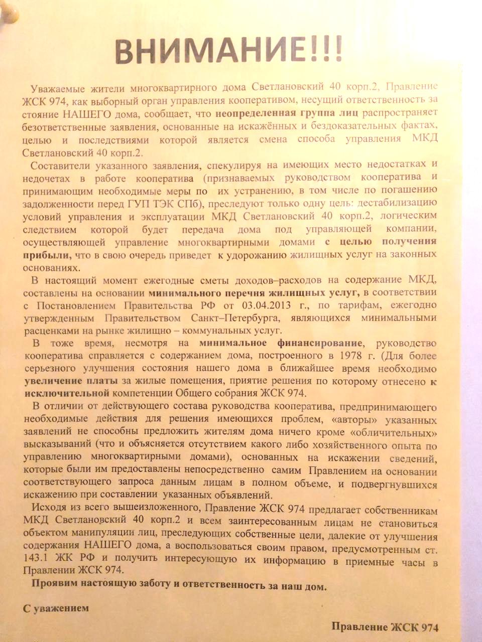 Правление ЖСК опубликовало официальный листок на стенде в каждом подъезде